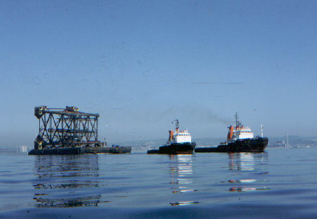 The Kittywake Jacket being towed out from the RGC yard in Methil. River Forth.