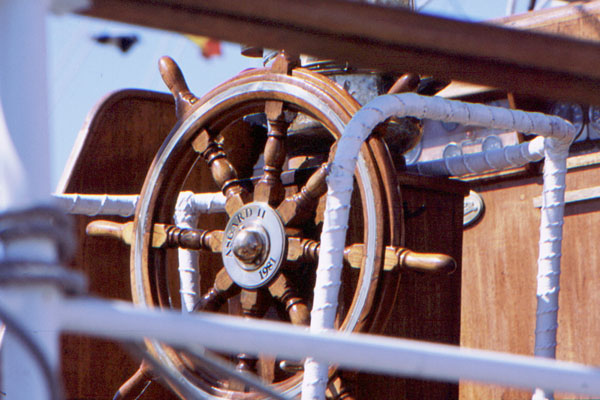 HMS Victory with Palinuro berthed in the foreground. Notice the gigs that are tied up under the bows. These gigs are normally stowed starboard and have to be floated to enable the gangplank to be lowered.